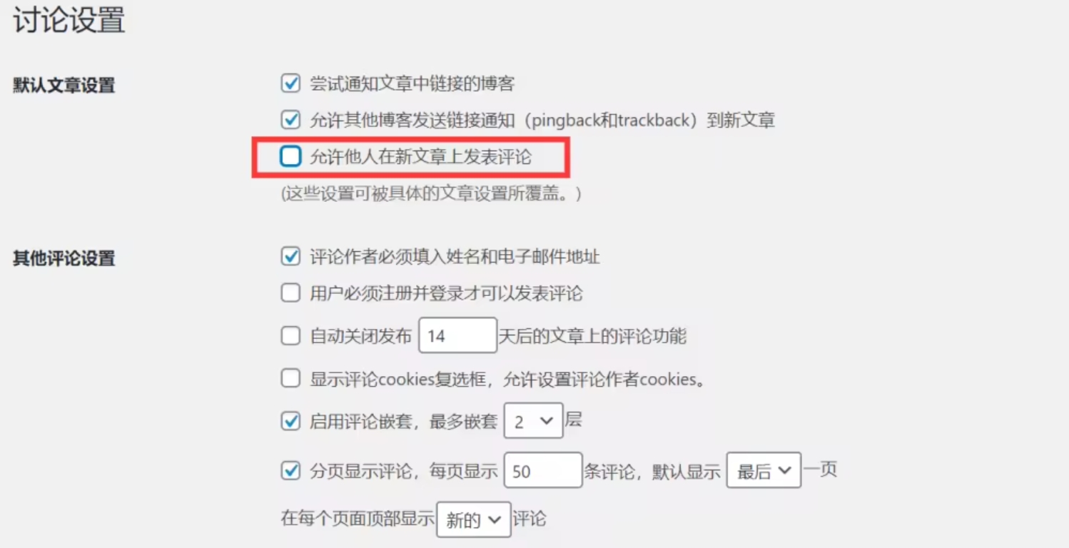 这是最懒人的一种办法。或许你的网站根本不需要使用到评论功能,为了保护自己免受垃圾评论的骚扰,干脆禁用它们。最简单的方法之一就是取消选中“ 设置”>“讨论”下的“ 允许他人在新文章上发表评论”选项。如下图所示: