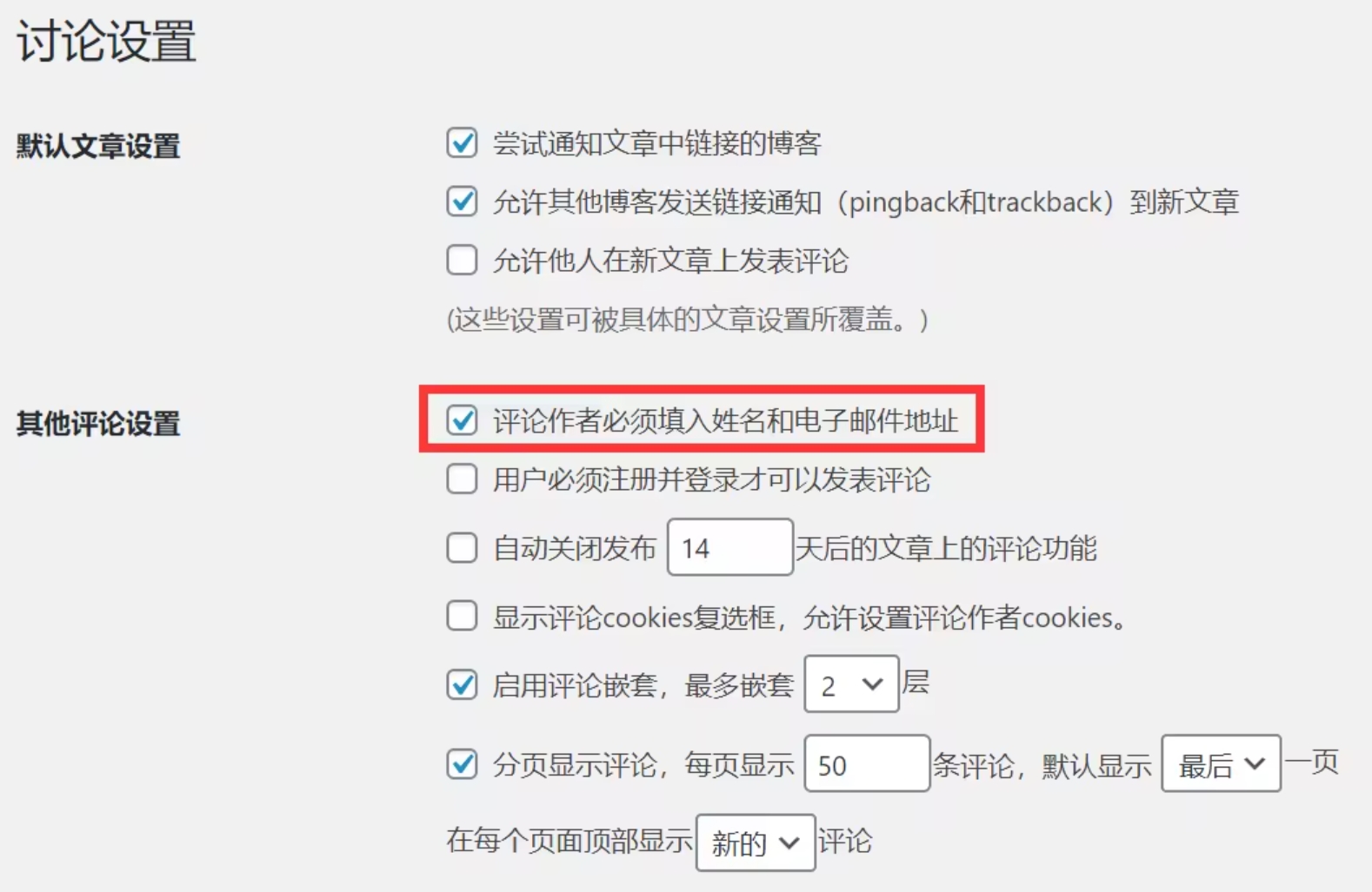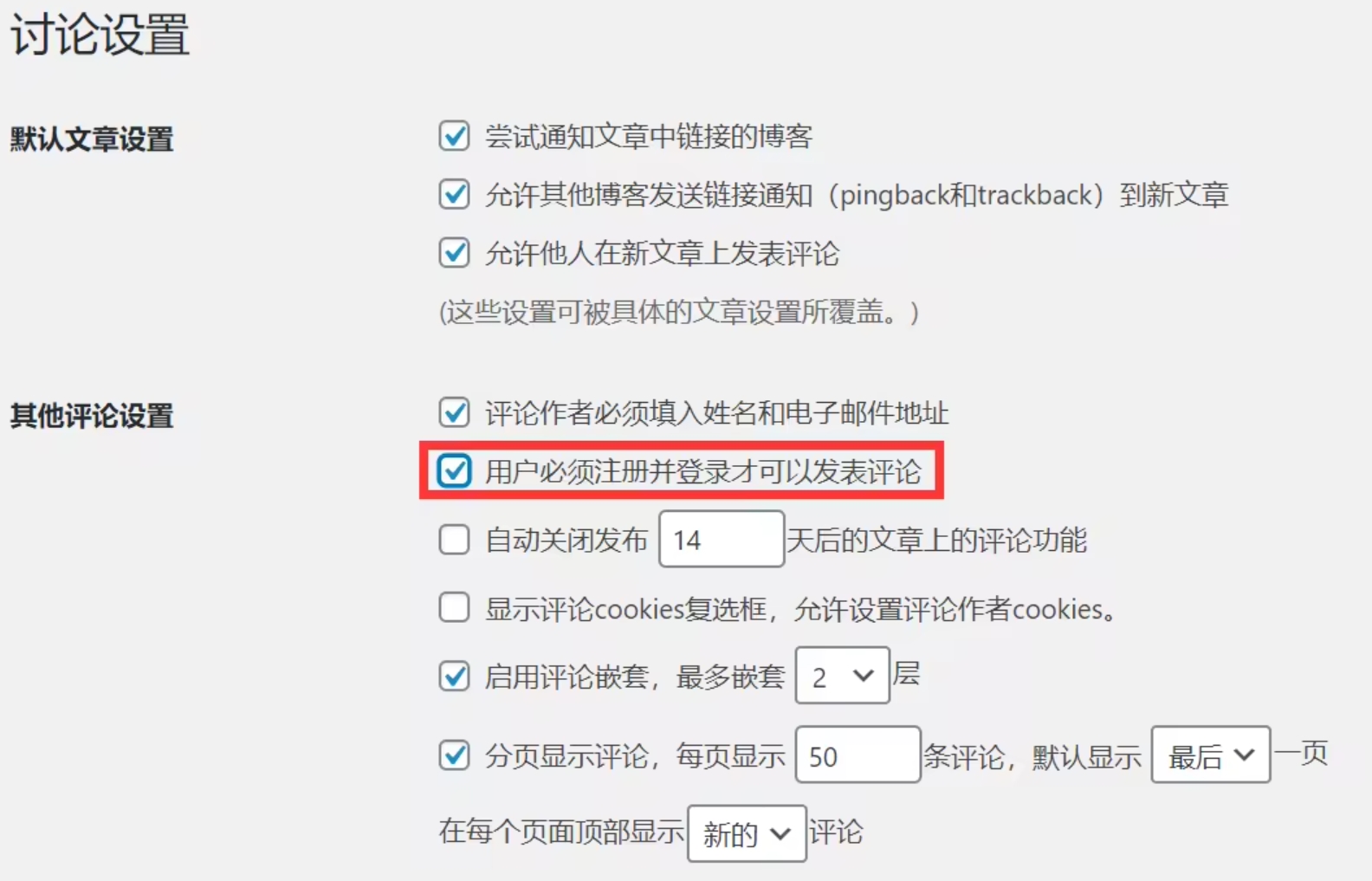 为此,请在“ 其他评论设置”部分,选中“ 用户必须注册并登录才可以发表评论”选项。