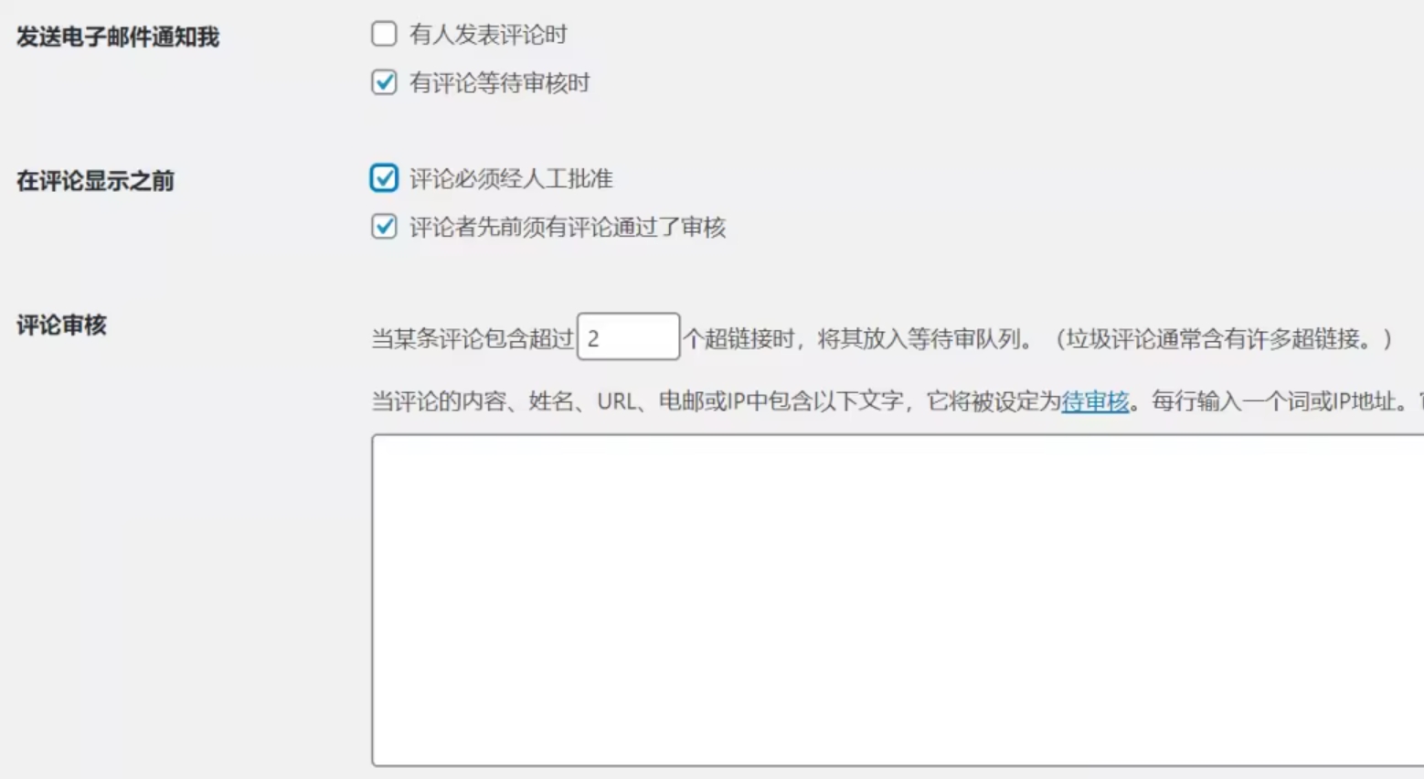 如果您不想完全禁止包含这些单词的评论,而是想对其进行审核,则只需将列表添加到“ 评论审核”列表中即可。这样,使用这些词的任何评论都将被保留以进行审核,而不是直接判断为垃圾评论。或者,您可以将两者结合使用,在一个字段中使用某些单词,在另一个字段中使用某些单词。
