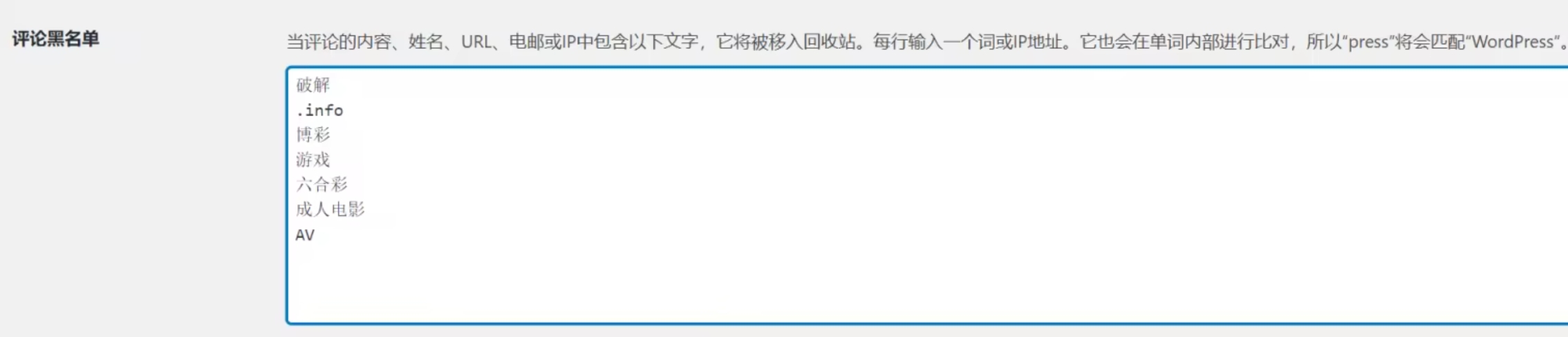 要创建列入黑名单的单词列表,请转到“ 评论黑名单 ”字段,然后输入列入黑名单的单词或短语,每行输入一个。它们不必局限于单词:它们可以包含电子邮件地址,网站URL,IP地址或您想要包含的任何内容。
